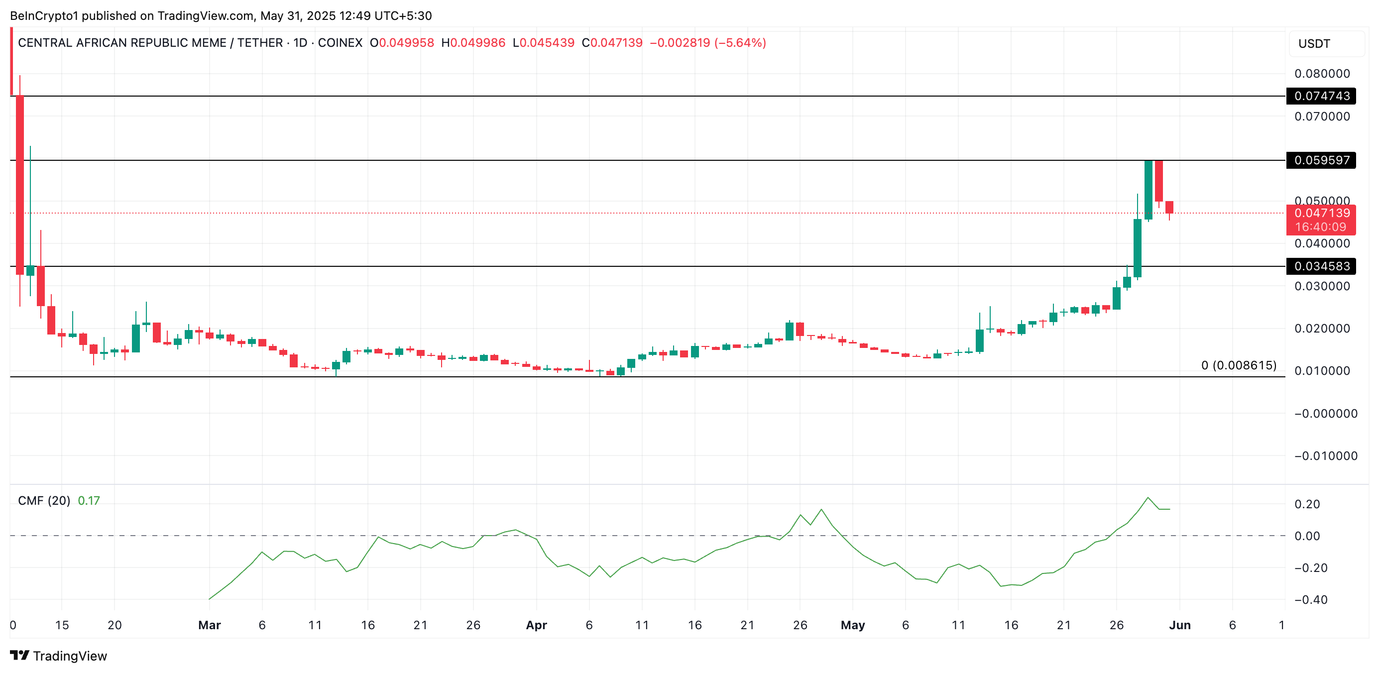 CAR ning Chaikin Money Flow (CMF) ko’rsatkichi, hozirda 0.17 da ijobiy hududda bo’lib, bu muhim qarshilik darajasidan yuqoriga ko’tarilish imkoniyatini kuchaytiradi.