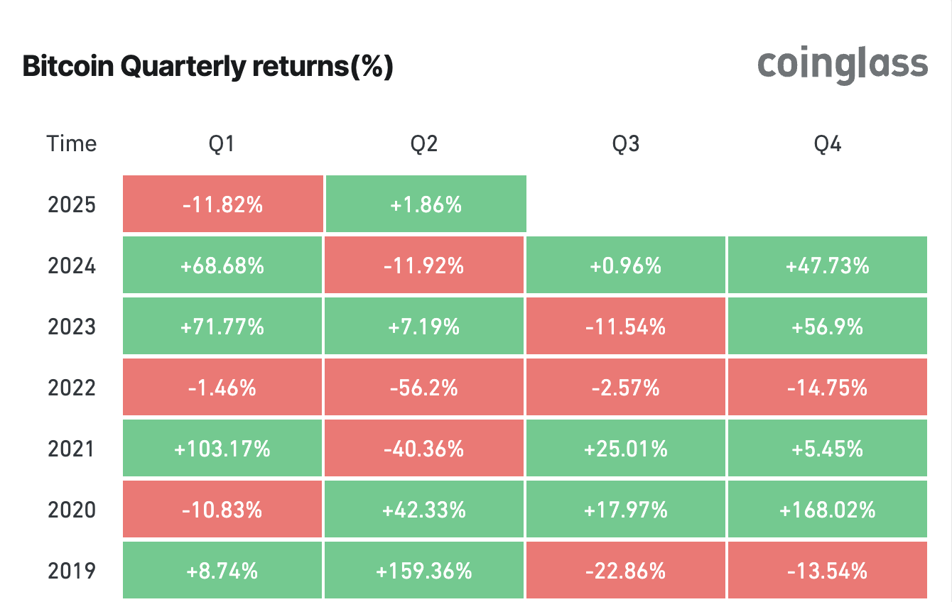 Bitcoinning 2025 yilning birinchi choragidagi ko’rsatkichlari 2018 yildan beri eng zaif bo’lib, bu yil BTC o’z qiymatining 50% dan ko’prog’ini yo’qotgan qattiq ayiq bozori bilan ajralib turadi. Coinglass ma’lumotlariga ko’ra, Bitcoinning 2025 yilning birinchi choragidagi ko’rsatkichlari 11.82% ga kamaygan. 2024 yilning birinchi choragida Bitcoin 68% dan ko’proq o’sishni qayd etdi.