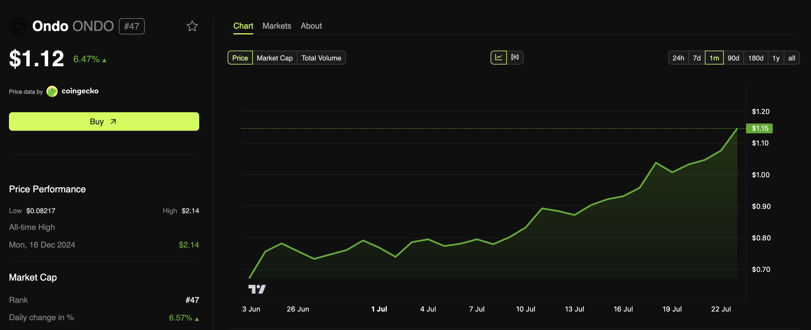 Yozish vaqtida, ONDO $1.12 da savdo qilinmoqda, bu esa o’tgan kun davomida 6.47% o’sishni anglatadi. Bundan tashqari, ko’plab kriptovalyutalar narxi oshgan bo’lsa-da, ONDOning o’sish sur’ati o’tgan hafta davomida global kripto bozoridan yuqori bo’ldi, bu uni ajralib turuvchi ishtirokchiga aylantirdi.