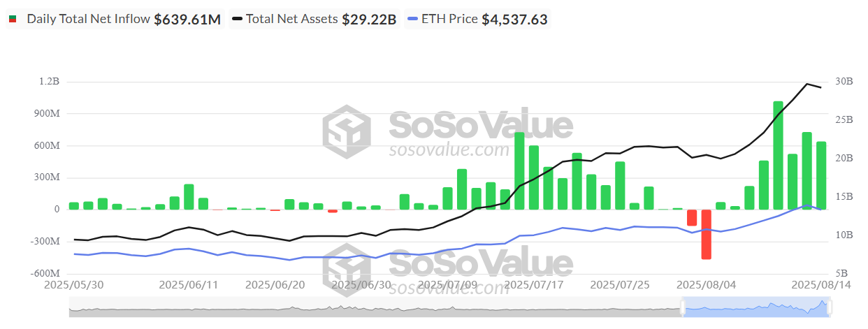 Ayni paytda, «SoSoValue» ma’lumotlari o’tgan hafta AQSh ETH ETF oqimlari kuniga 400 million dollardan 1 milliard dollargacha bo’lganini ko’rsatadi, bu DefiMoonning taxminlaridan oshib ketdi.