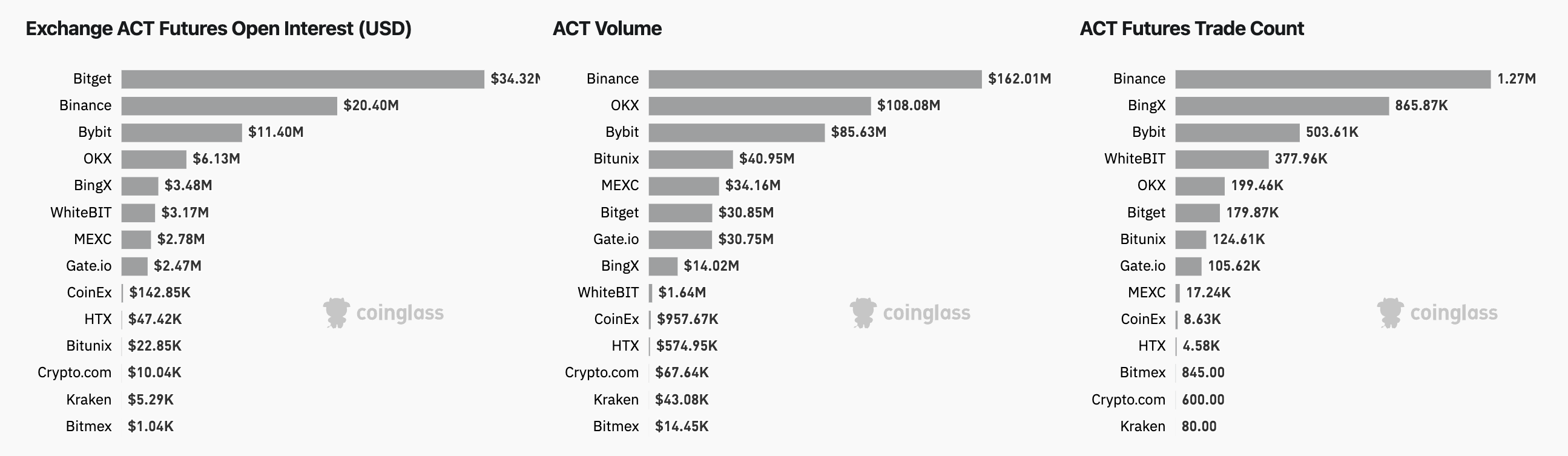 Coinglass ma’lumotlariga ko’ra, Binance’da 1.27 milliondan ortiq ACT futures savdolari amalga oshirilgan, bu ikkinchi o’rindagi BingX birjasidan ikki baravar ko’p. Binance shuningdek, ACT futures ochiq foizlarida 20.4 million dollardan ortiq mablag’ni ushlab turadi.