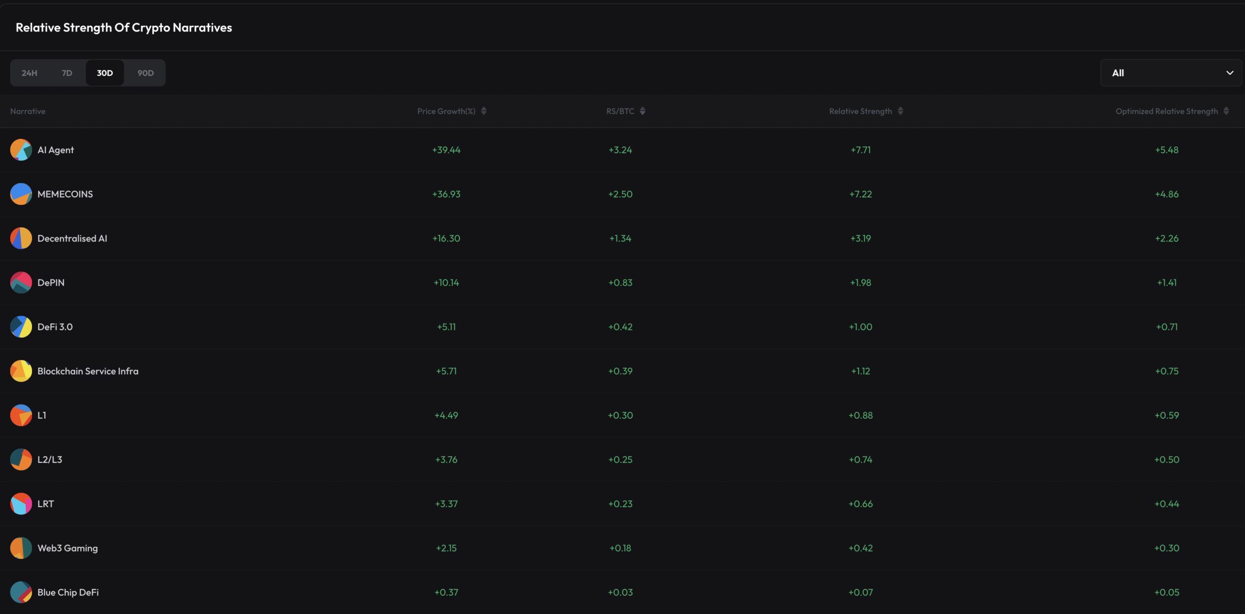 Biroq, bu tendensiya o’zgardi. O’tgan oy davomida AI agentlari 39,4% narx o’sishini ko’rsatdi. Bu sektor boshqa mavzulardan, masalan, mem tangalar (+36,9%) va markazlashmagan AI (+16,3%) dan ustun keldi.