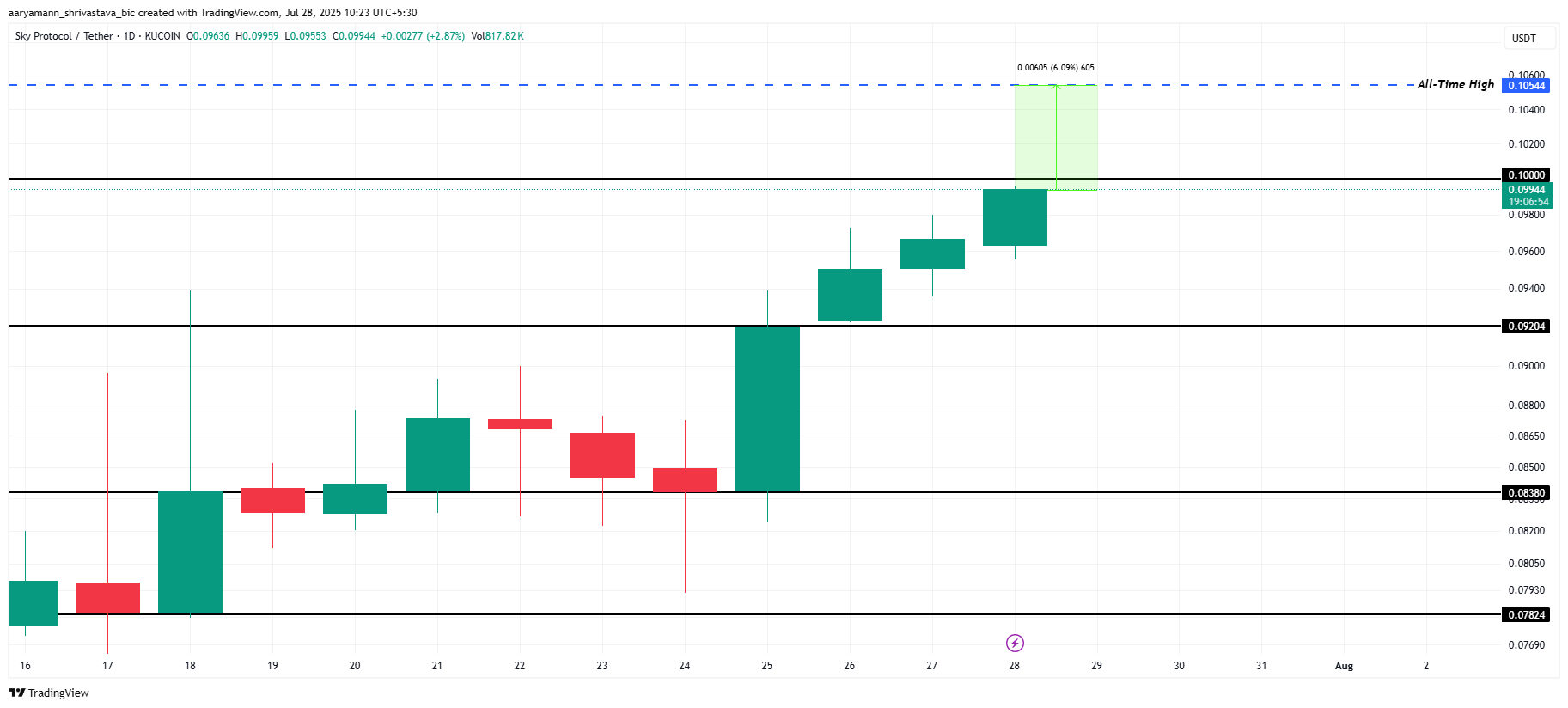 SKY hozirda $0.0994 narxda savdo qilmoqda, bu uning tarixiy maksimumi (ATH) $0.1054 dan atigi 6% uzoqlikda. Investorlar bu darajani yetti oydan beri kutishmoqda. Altkoin yuqoriga ko’tarilish belgilari ko’rsatmoqda, agar hozirgi tendensiyalar davom etsa, ATH ga yetishi mumkin.