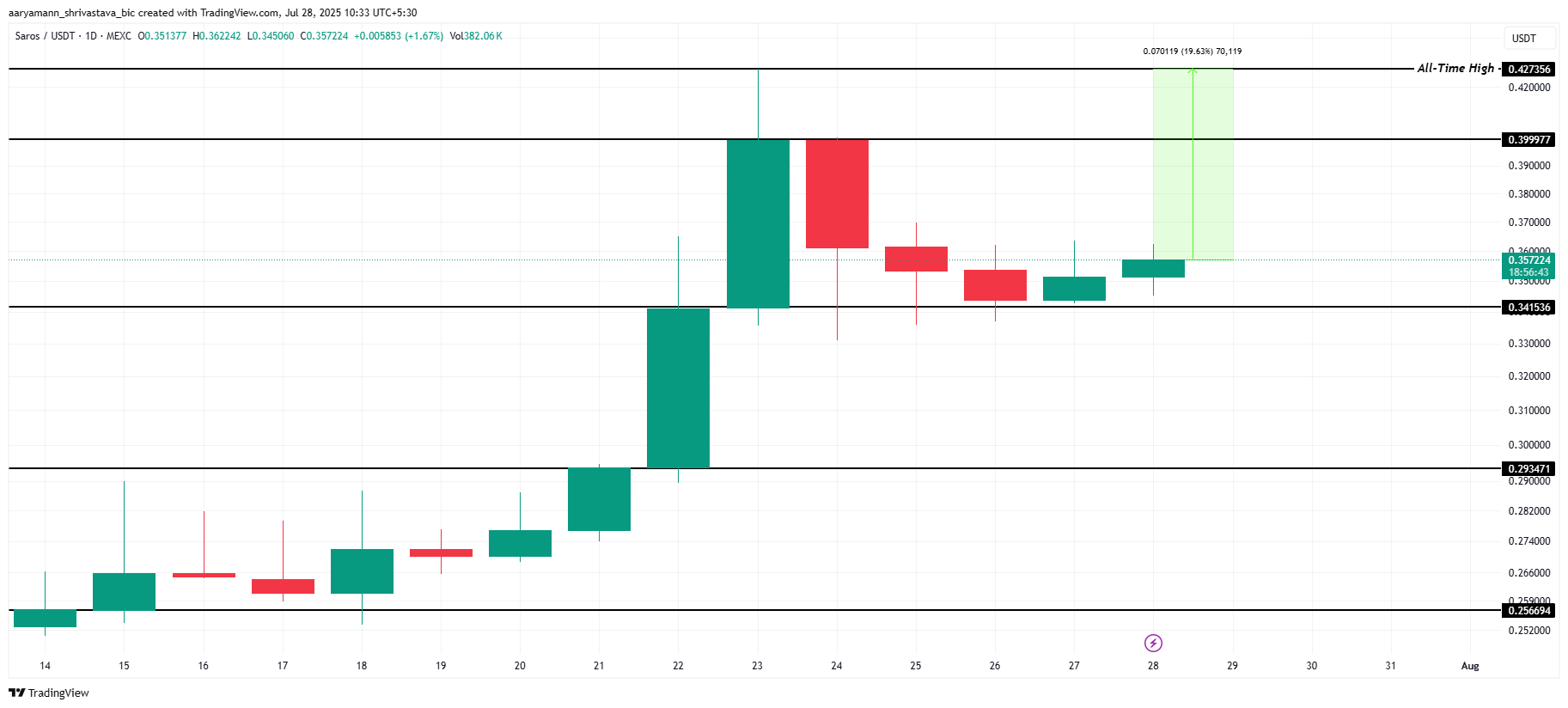 SAROS narxi hozirda $0.357 da, $0.341 qo’llab-quvvatlash darajasidan qaytgandan so’ng yuqoriga ko’tarilish ko’rsatmoqda. Altkoin uning tarixiy maksimumi (ATH) $0.427 dan taxminan 20% uzoqlikda. Bu SAROS ning hozirgi tendensiya davom etsa, yanada o’sish imkoniyatiga ega ekanligini ko’rsatadi.