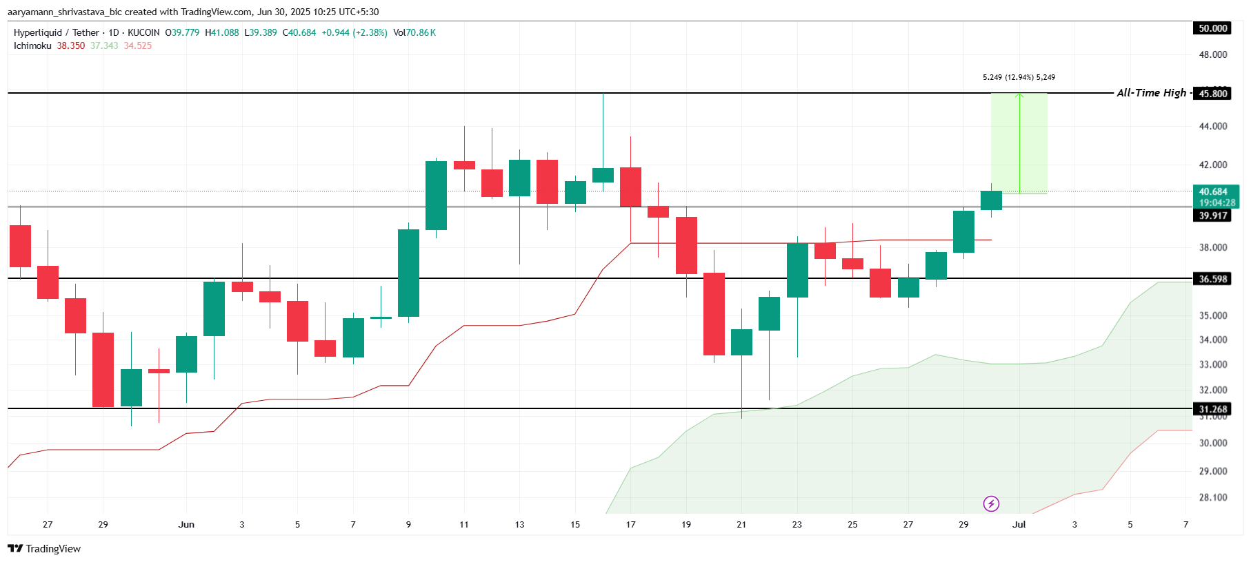 Hozirda HYPE o’zining $45.8 tarixiy maksimumidan atigi 13% uzoqlikda. Ichimoku buluti ijobiy harakatni ko’rsatmoqda, bu esa altkoinning ushbu maqsadga kuchli intilishiga imkon beradi. Ijobiy ko’rinish HYPEning tez orada o’zining avvalgi tarixiy maksimumini sinab ko’rishi va undan oshib ketishi mumkinligini ko’rsatmoqda.