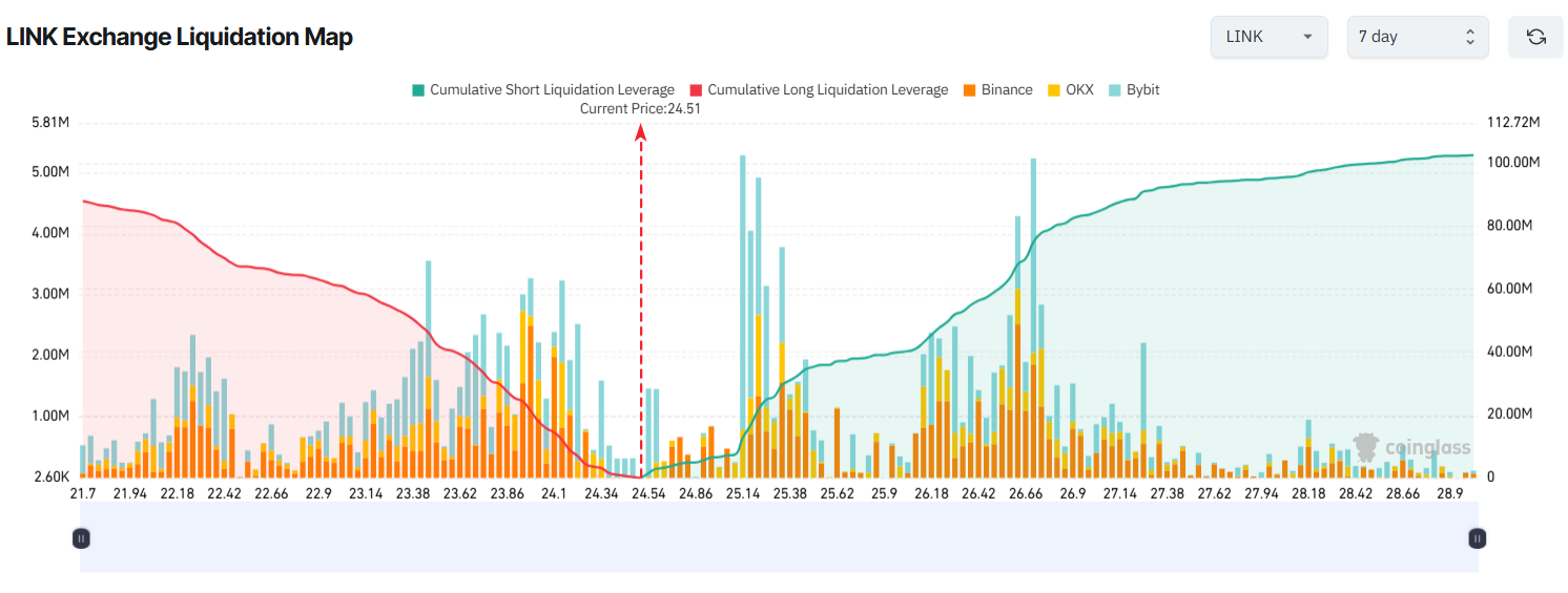 LINK narxi $22 dan pastga tushsa, taxminan $85 millionlik uzoq muddatli pozitsiyalar likvidatsiya qilinishi mumkin. Agar LINK $27 ga ko’tarilsa, taxminan $85 millionlik qisqa muddatli pozitsiyalar likvidatsiya xavfiga duch keladi. Narx oralig’i bir xil va likvidatsiya hajmi deyarli bir xil.