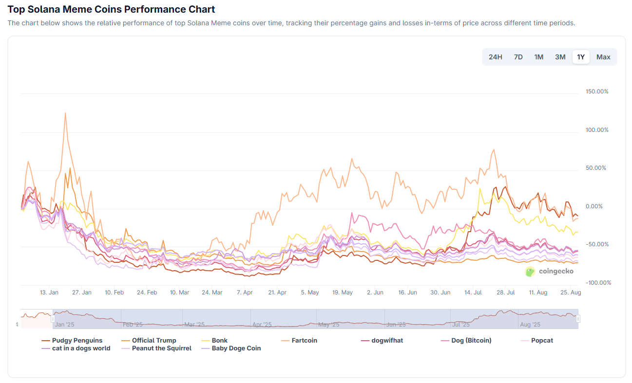 «CoinGecko» ma’lumotlariga ko’ra, Solana tarmog’idagi eng yaxshi memkoinlarning yil boshidan beri ko’rsatkichlari salbiy. Eng yuqori likvidlikka ega bo’lishiga qaramay, bu tokenlar 10% dan 70% gacha yo’qotishlarni qayd etgan.