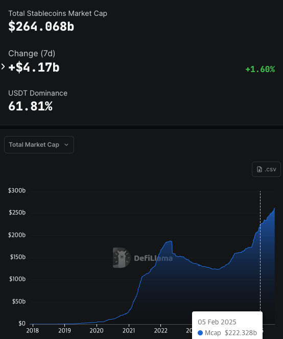 Stabilkoin bozorlari «GENIUS Act»ning yakuniy qabulidan bir hafta ichida 4 milliard dollarlik kapital kirimlarini jalb qildi, deb xabar beradi DeFiLlama ma’lumotlari. Umumiy stabilkoin bozor kapitalizatsiyasi 264 milliard dollardan oshib, yanvardan beri 26,9% o’sishni ko’rsatdi.