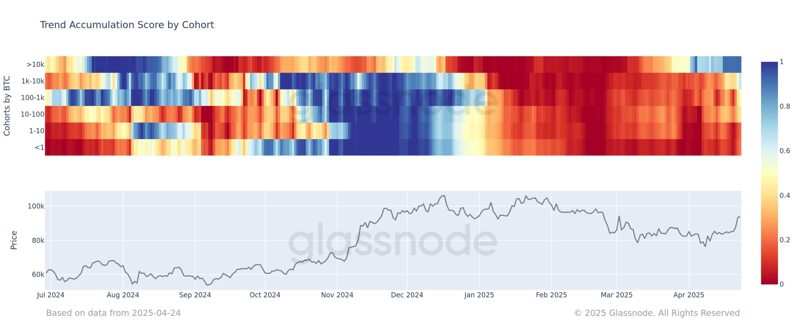 Kitlardan keyin, 1,000 dan 10,000 BTC gacha bo’lgan hamyonlar aprel oyining ikkinchi yarmida to’planish ballini asta-sekin oshirdi. Ularning balli 0.7 ga yetdi, bu grafikning rangi sariqdan ko’kka o’zgarishini ko’rsatadi. Boshqa hamyon darajalari ham to’planish belgilari ko’rsatmoqda, bu kichik kitlar orasida hissiyotlarning o’zgarishini aks ettiradi.