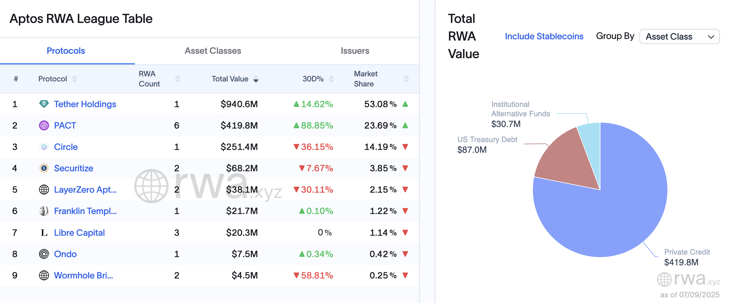 «RWA.xyz» ma’lumotlariga ko’ra, Aptos’ning umumiy qulflangan aktivlar qiymati (RWA TVL) so’nggi 30 kun ichida 56.28% ga oshib, $538 millionga yetdi.