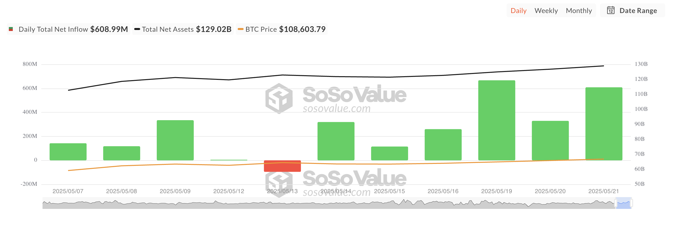 Bu ijobiy harakatga qo’shimcha ravishda, Bitkoin spot birja savdo fondlari (ETF) kecha katta miqdorda kirimlarni qayd etdi. Ular $609 millionni tashkil etdi. Bu seshanba kuni qayd etilgan $329.02 milliondan 85% ko’proq bo’lib, bu fondlarga ketma-ket oltinchi kun ijobiy kirimlar bo’lganligini ko’rsatadi.