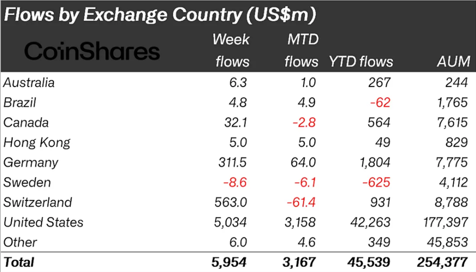 O’sha paytda, AQShdagi investorlar 1 milliard dollardan ortiq mablag’ni qaytarib olishdi, bu esa keng tarqalgan ehtiyotkorlikni ko’rsatdi. Endi bu ehtiyotkorlik optimizmga o’zgardi. AQSh o’tgan haftadagi kirishlarni 5,0 milliard dollarlik rekord bilan boshqardi, Shveytsariya (563 million dollar) va Germaniya (312 million dollar) ham tarixiy yuqori ko’rsatkichlarni qayd etdi.