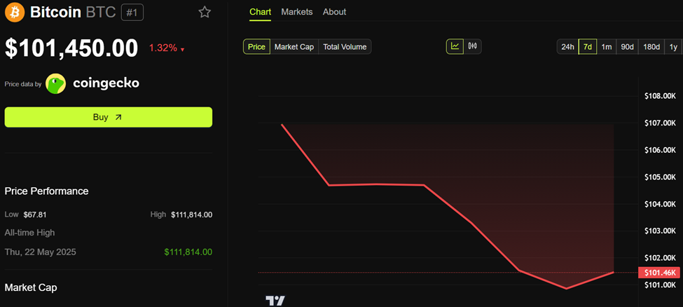 «BeInCrypto» ma’lumotlariga ko’ra, Bitkoin $101,450 ga savdo qilinmoqda, bu so’nggi 24 soatda 1.32% ga pasaygan.