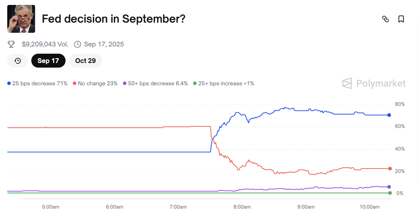 Bashorat bozorlarida bu o’zgarish allaqachon aks etmoqda. «Polymarket» kabi platformalarda sentabr oyida stavka pasayishi ehtimoli oshdi, bu esa investorlarning Federal zaxira siyosatidagi o’zgarishlarga ishonchini ko’rsatmoqda.