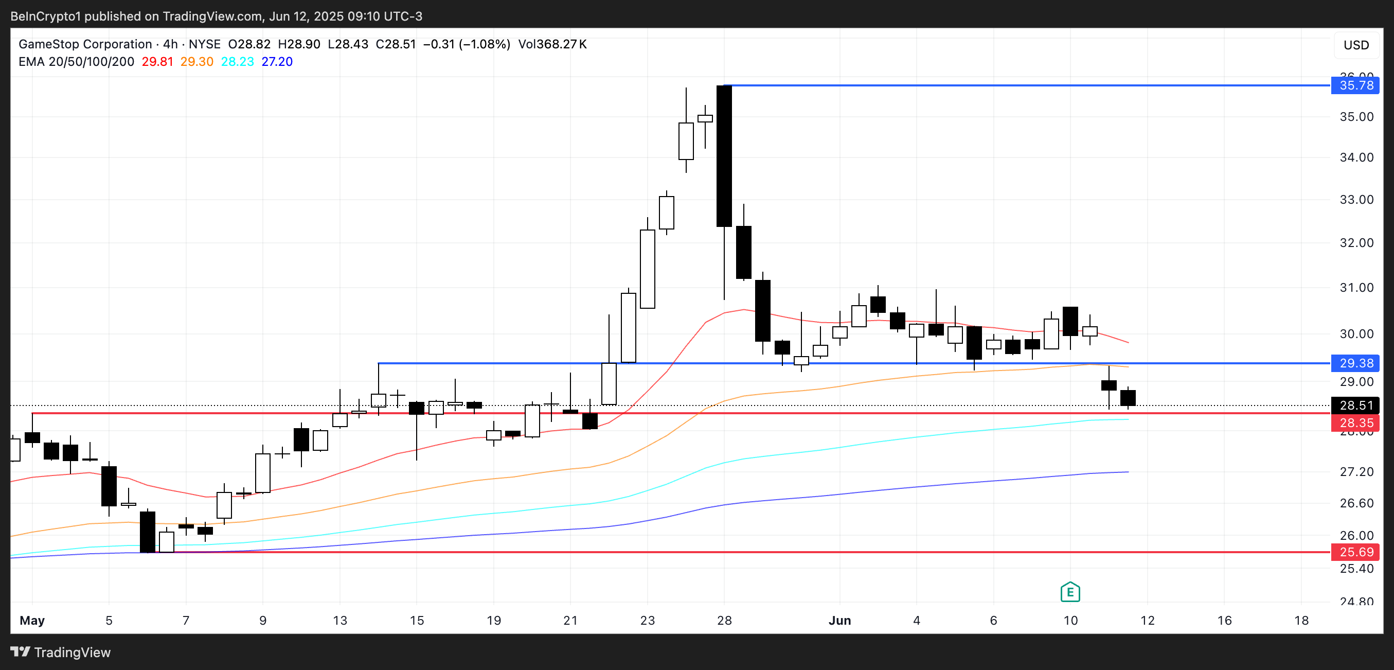 GME aksiyalari kecha 5.31% ga pasaydi va oldindan savdoda yana 16% ga tushdi. Aksiya $28.35 darajasidagi muhim qo’llab-quvvatlash darajasidan biroz yuqorida turibdi; agar bu daraja muvaffaqiyatsiz bo’lsa, u tezda $25.69 ga tushishi mumkin, keyinchalik $23 ga tushish xavfi mavjud.