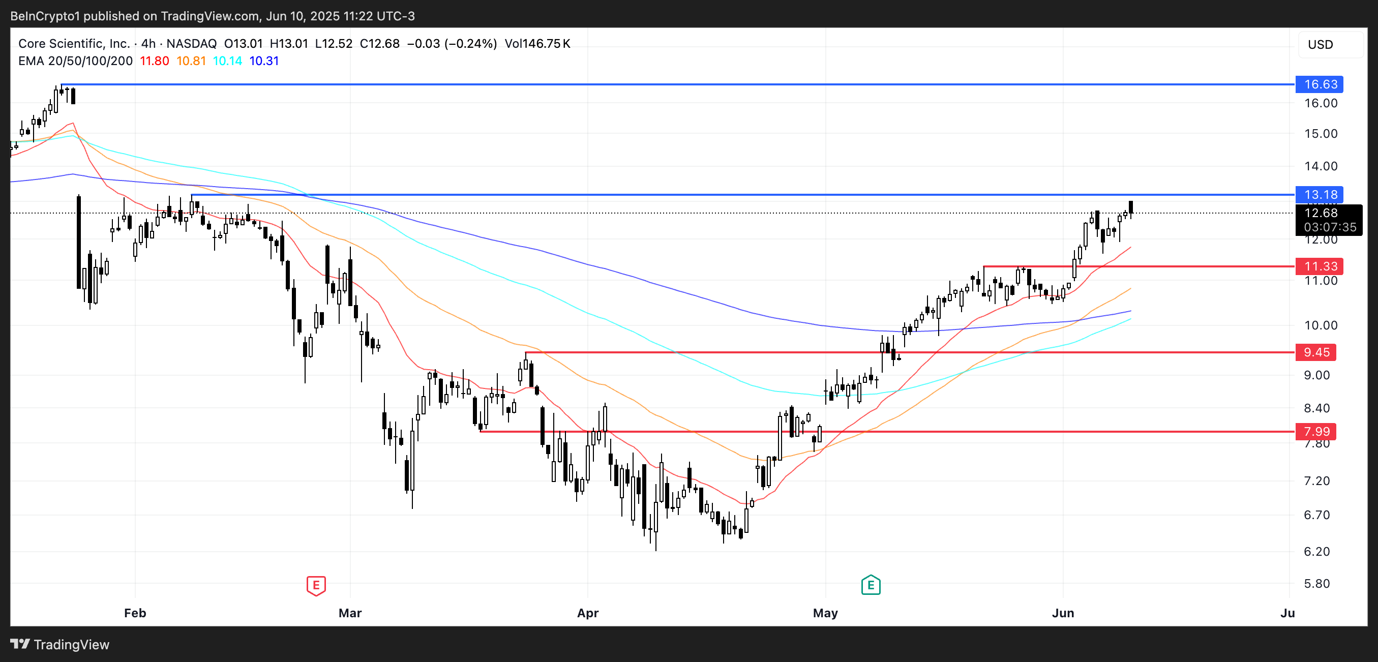 CORZ hozirda $13.18 asosiy qarshilik darajasi yaqinida savdo qilinmoqda. Ushbu qarshilikni muvaffaqiyatli yengib o’tish aksiyani yuqoriga ko’tarishi va $16.63 ga yetkazishi mumkin.