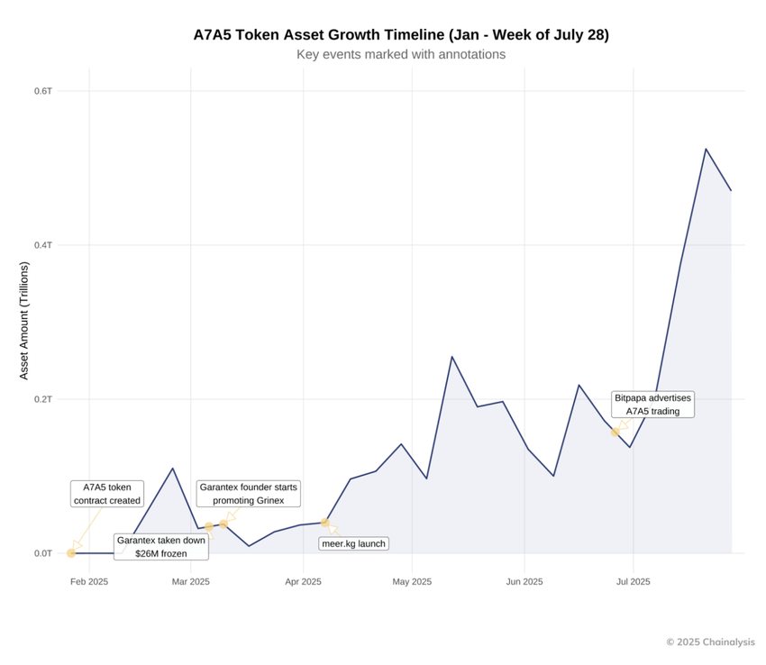 Hokimiyatlar birjaning veb-saytini musodara qildi va $26 million Tether (USDT)ni muzlatdi. «Garantex»ning yo’q qilinishi A7A5ning o’sishiga turtki berdi. Ko’plab rus foydalanuvchilari muzlatilishi oson bo’lgan USDTdan ko’ra xavfsizroq variantni izladilar. «Grinex», «Garantex» o’rnini egallagan deb hisoblangan kripto birja, A7A5 savdosi uchun asosiy markazga aylandi.