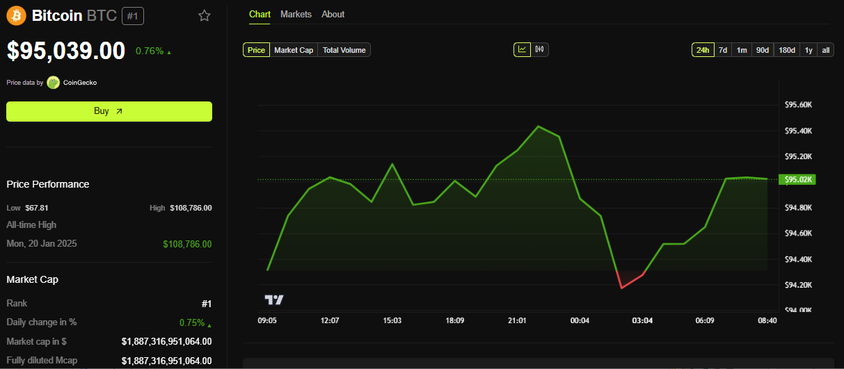 Bu orada, Bo Xaynsning da’volariga qaramay, Bitkoin narxi so’nggi 24 soat ichida atigi 0.76% ga oshdi va hozirda $95,039 ga savdo qilinmoqda.