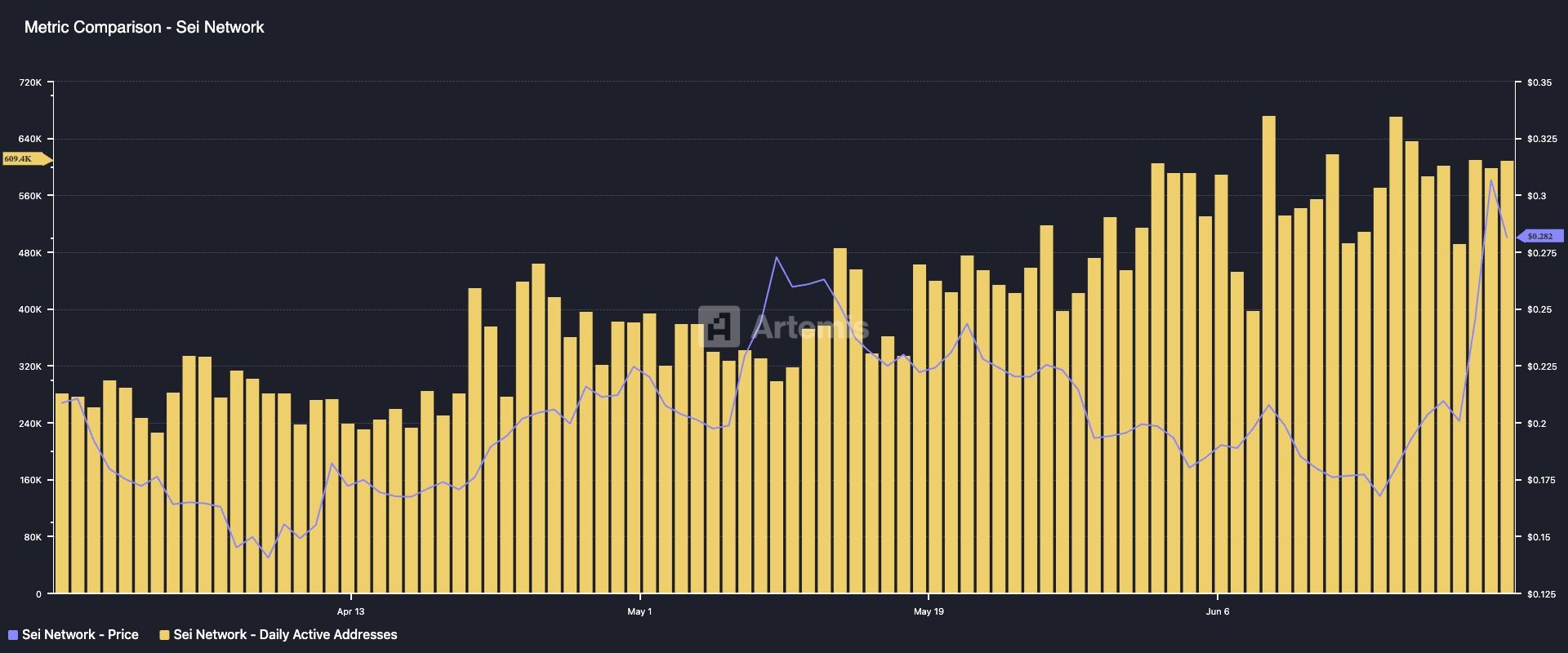 O’tgan oy davomida Sei Network foydalanuvchi faolligida o’sish kuzatildi. Artemis ma’lumotlariga ko’ra, ushbu davrda blokcheyndagi kunlik faol foydalanuvchilar soni 609,448 ga yetib, 17.36% ga oshdi.