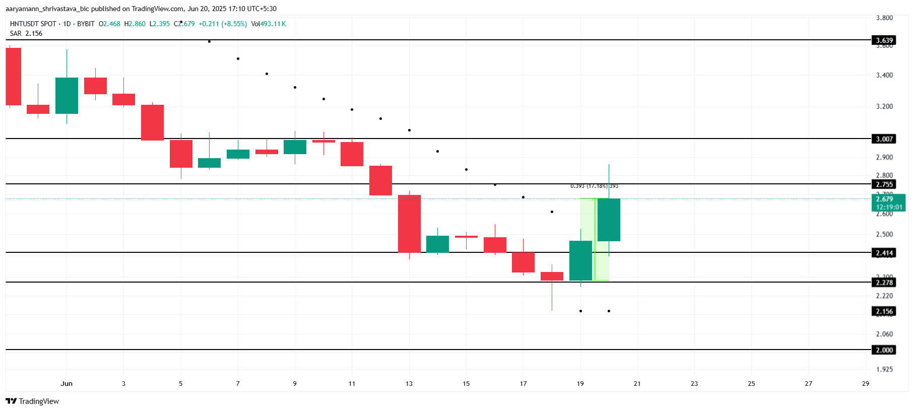 HNT oylik boshidan beri birinchi marta ayirbosh bozoridan o’sish bozoriga o’tdi. Altkoin 17% ga o’sib, hozirda $2.67 narxda savdo qilinmoqda. Bu harakatning sezilarli o’zgarishini ko’rsatadi va HNT yaqin kelajakda ijobiy narx harakatini davom ettirishni maqsad qilmoqda.