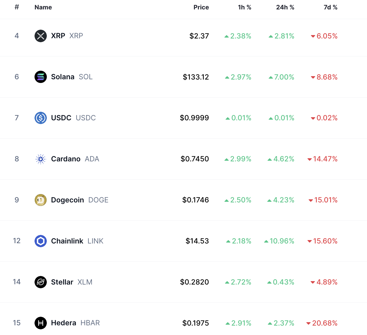Bir nechta AQShda ishlab chiqarilgan tokenlar Tramp oilasi tomonidan qo’llab-quvvatlanadigan World Liberty Financial bilan bog’langan. WLFI LINK va AAVE-ga katta sarmoyalar kiritdi va SUI va ONDO bilan hamkorliklarni davom ettirdi. O’tgan juma kuni bo’lib o’tgan sammitdan so’ng, barcha ushbu aktivlar deyarli 20% ga tushib ketdi.