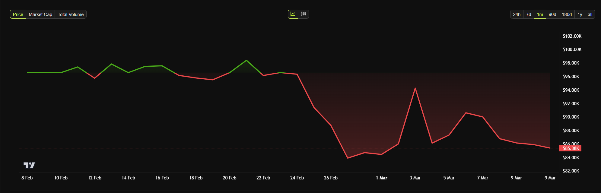 BeInCrypto ma’lumotlariga ko’ra, Bitcoin xabar berish vaqtida $85,384 ga savdo qilinayotgan edi, o’tgan oyda 12% pasaygan.
