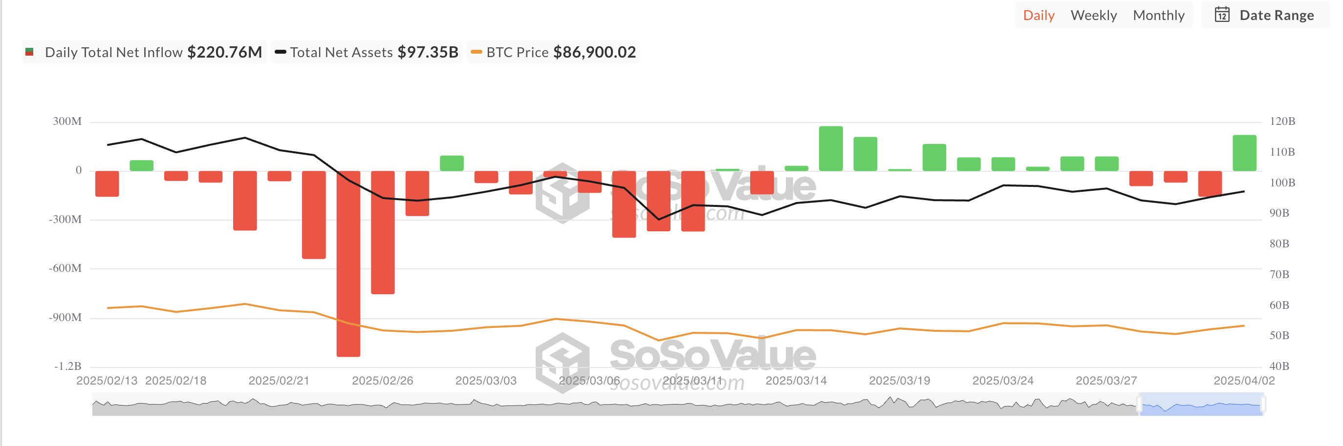 2-aprel kuni spot BTC ETFlarida ijobiy oqimlar kuzatildi, spot Bitcoin mahsulotlariga 221 million dollar kiritildi. Ark Invest va 21Sharesning ETF ARKB bu oqimni boshqardi, kunlik sof oqimi 130,15 million dollarni tashkil etdi va boshqaruvidagi sof aktivlarini 4,14 milliard dollarga yetkazdi.