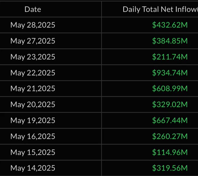 «Bitcoin» ETF (birja savdo fondlari) 10 kun davomida har kuni 100-900 million dollar oralig’ida mablag’ kiritildi. Bu esa umumiy o’sishni 4,3 milliard dollardan oshirdi. «IBIT» kabi ETFlar o’zlarining o’zgaruvchanligini yo’qotib, yangi institutsional investitsiyalarni jalb qilmoqda.