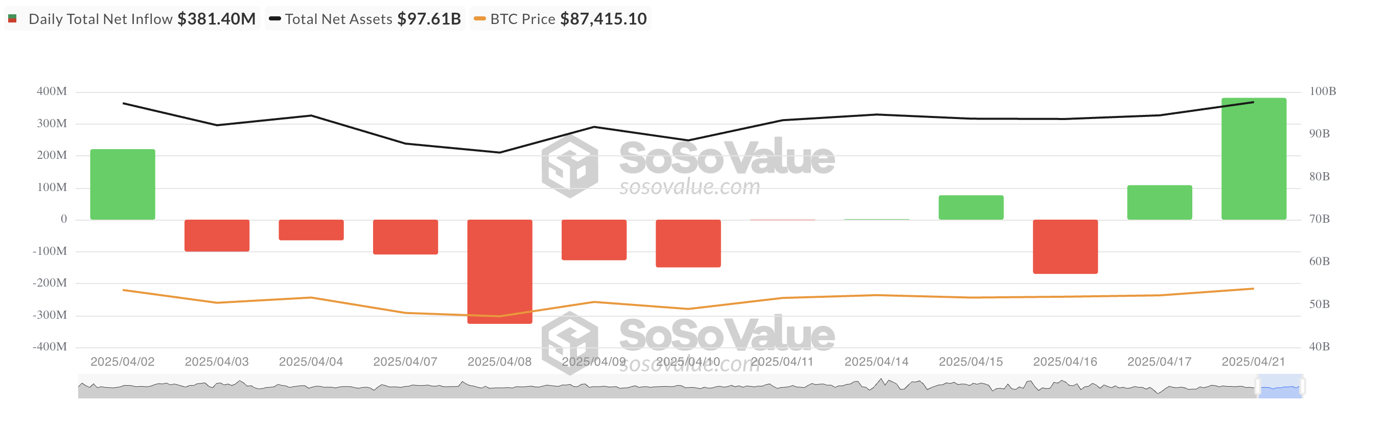 Dushanba kuni BTC ETFlarida sof kirim 381,40 million dollarni tashkil etdi. Bitkoin ETFlari oxirgi marta bunday katta miqdorda mablag’ni bir kunda qabul qilganiga deyarli 13 hafta bo’ldi, bu esa so’nggi o’sishni muhim qiladi.