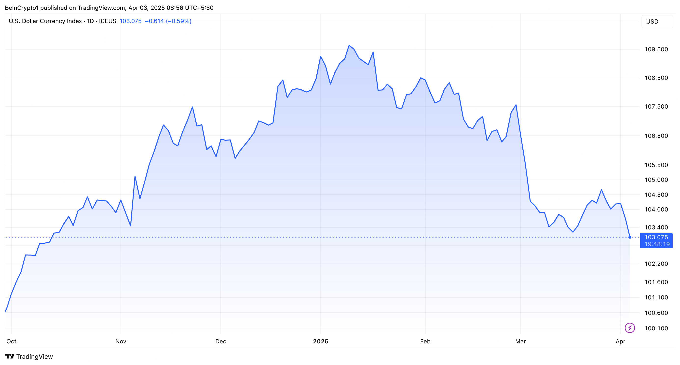 BeInCrypto 2025 yil 2 aprel kuni Prezident Tramp yangi “Ozodlik kuni” tariflarini joriy etganini xabar qildi. Ushbu o’zaro tariflar barcha importlarga kamida 10% boj solig’ini joriy etadi. Shunga qaramay, ular global savdo urushi xavotirlarini kuchaytirdi va dollar qiymatini yanada zaiflashtirdi.