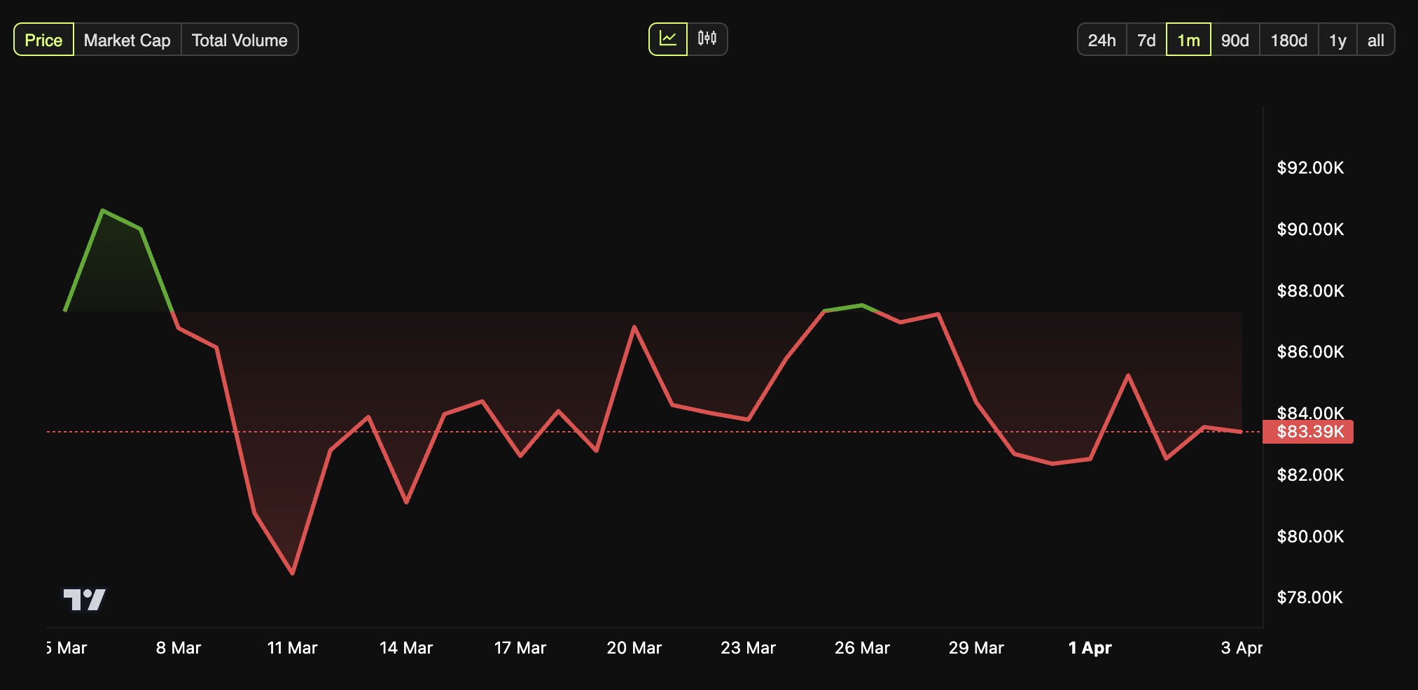 Hozirgi vaqtda, Bitcoin bozor noaniqligidan ta’sirlandi. U so’nggi kunda 1.5% ga pasayib, savdo qiymati $83,389 ga tushdi. Xuddi shunday, kengroq kriptovalyuta bozori ham pasayishni boshdan kechirdi, umumiy bozor kapitallashuvi shu vaqt ichida 3.4% ga kamaydi.
