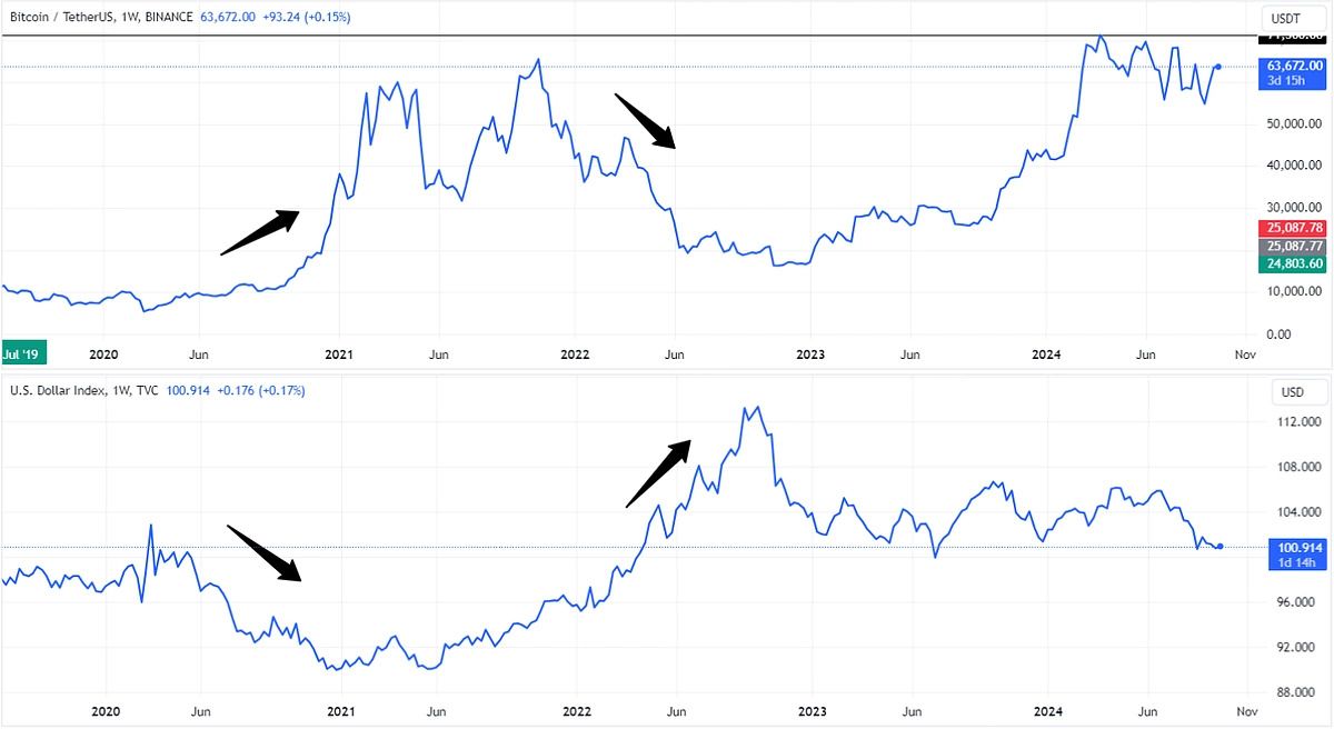 Sunning tahlili 2024 yil oxiridagi CoinGecko hisobotida keltirilgan Bitcoin va AQSh dollari o’rtasidagi teskari korrelyatsiyaga mos keladi.