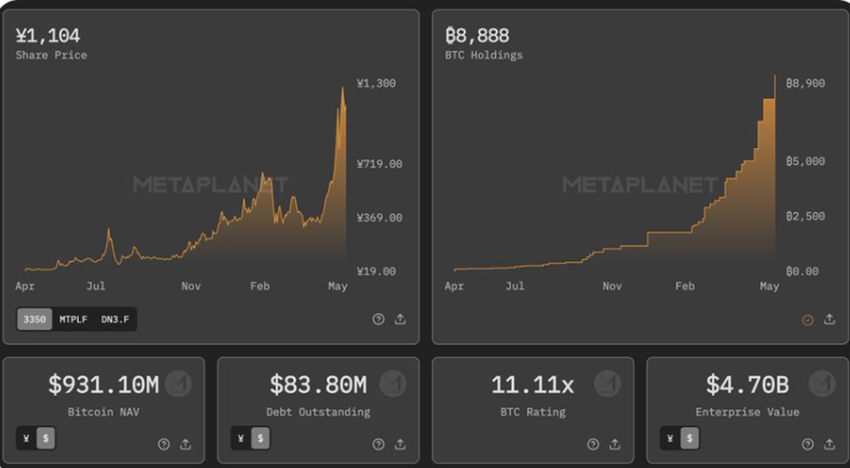 Ushbu post «Metaplanet»ning Bitkoin strategiyasini ko’rsatadi, 8,888 BTC zaxiralari 4,7 milliard dollar qiymatga ega, ¥1,1604 aksiyalar narxi va ¥931,1 million Bitkoin bozor qiymatini ko’rsatadi.