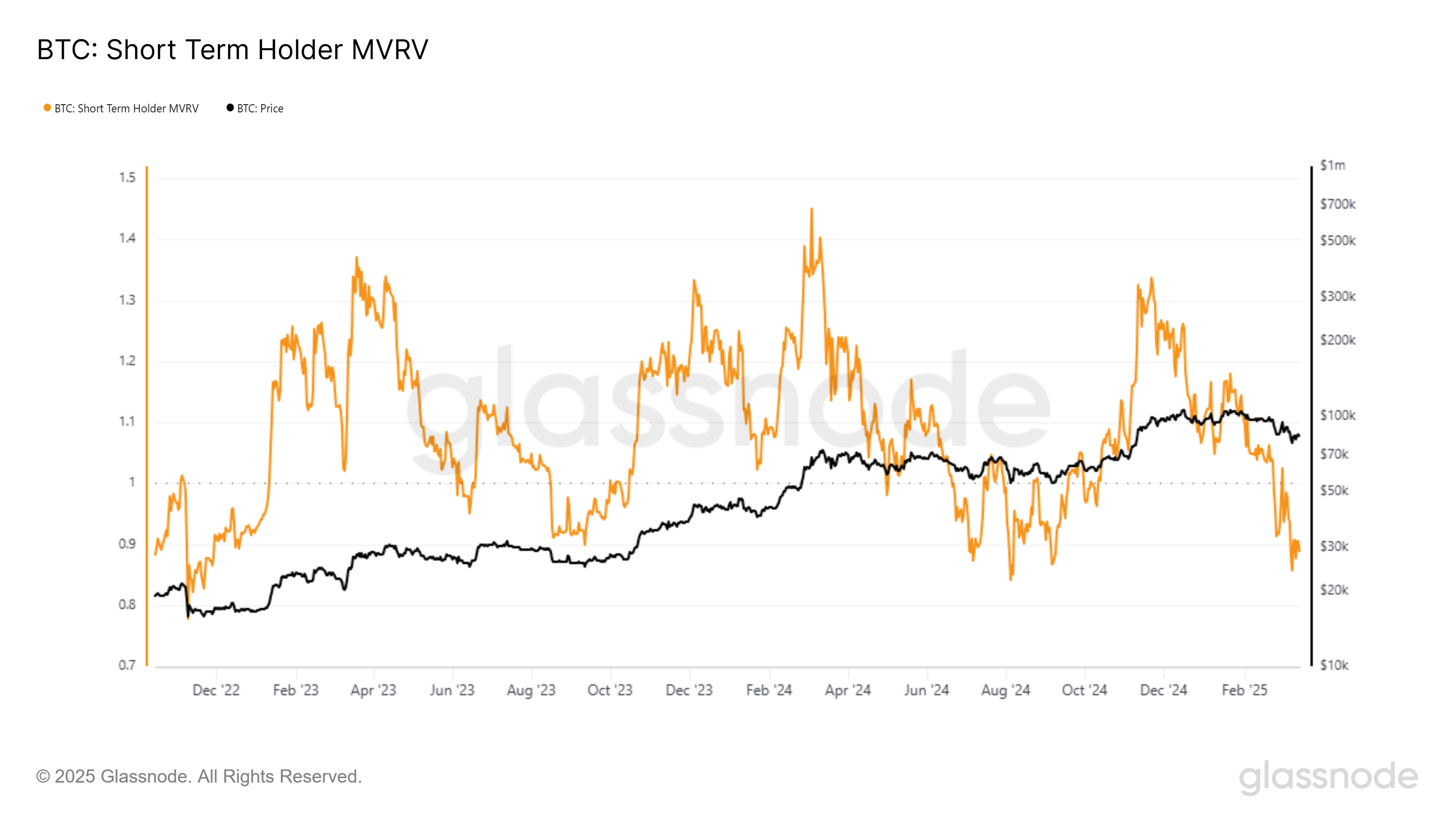 Qisqa muddatli MVRV 0.9 darajasidan pastga tushdi, bu esa tarixan STH sotish uchun to’yinganlik nuqtalari bilan bog’liq. Ushbu ko’rsatkich ko’pincha sotish bosqichining tugashini va potentsial narx o’zgarishini bildiradi. Agar tarix takrorlansa, Bitcoin tez orada yangilangan sotib olish bosimini ko’rishi mumkin, bu esa tiklanish uchun zamin yaratadi.