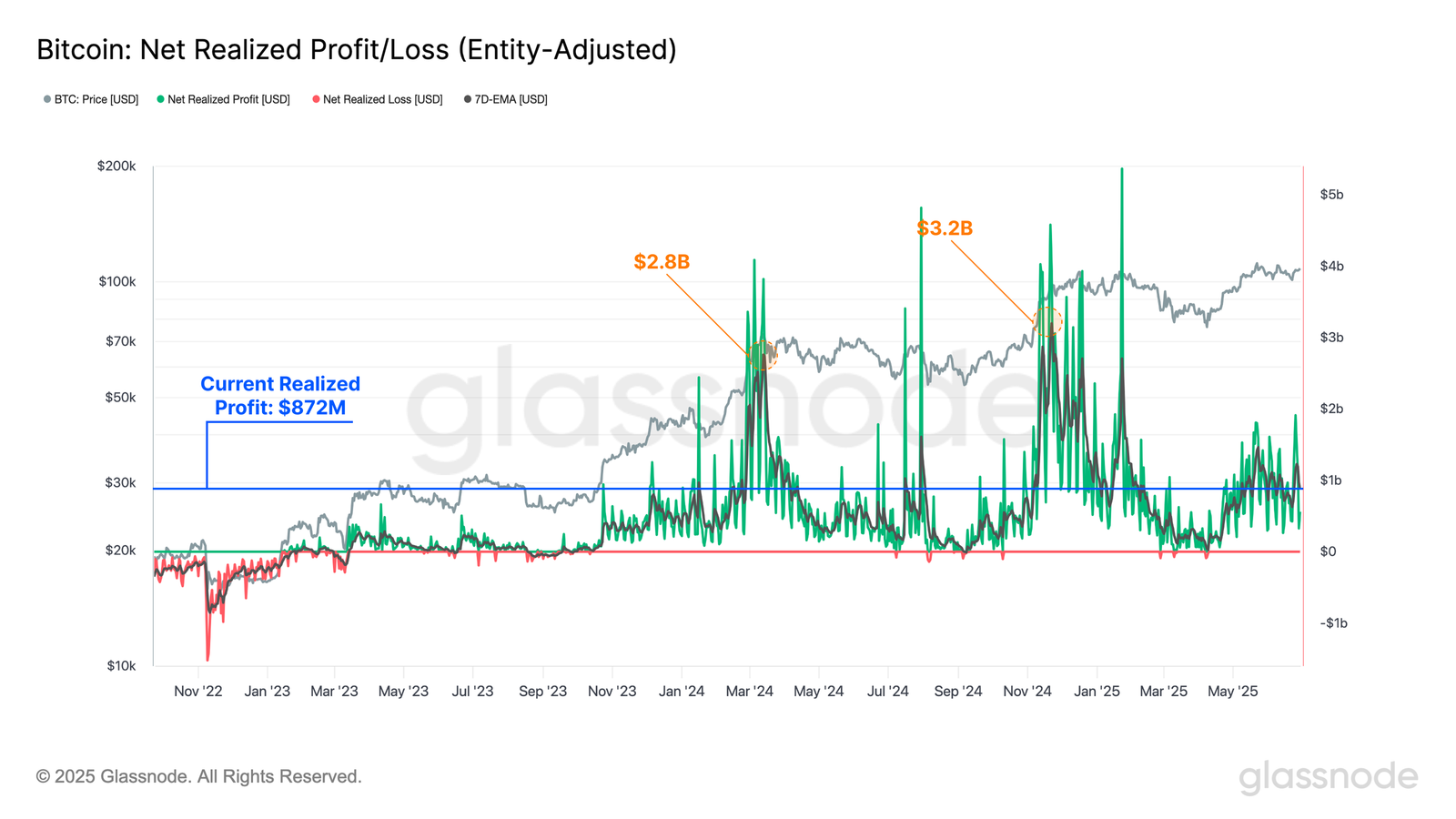 Yaxshi narx harakatiga qaramay, so’nggi haftalarda amalga oshirilgan foydalar nisbatan past darajada qoldi. Bitkoinning hozirgi narxi o’zining tarixiy maksimumidan uncha uzoq emas, lekin kuniga faqat $872 million foyda amalga oshirilmoqda. Bu avvalgi narx ko’tarilishlarida, masalan, $73,000 va $107,000 narx nuqtalarida ko’rilgan $2.8 milliard va $3.2 milliard foydalardan ancha farq qiladi.
