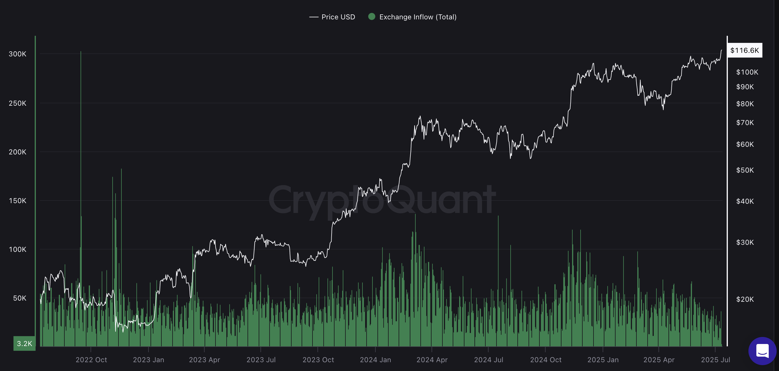 «CryptoQuant» ma’lumotlariga ko’ra, Bitkoinning birjalarga kirish oqimlari kuniga atigi 3,2000 Bitkoinni tashkil etmoqda (yozish vaqtida), bu 2015 yildan beri eng past ko’rsatkich. 2024 yil dekabr oyida bu raqam $100,000 Bitkoin narxi o’sishi davrida taxminan 97,000 Bitkoin edi.