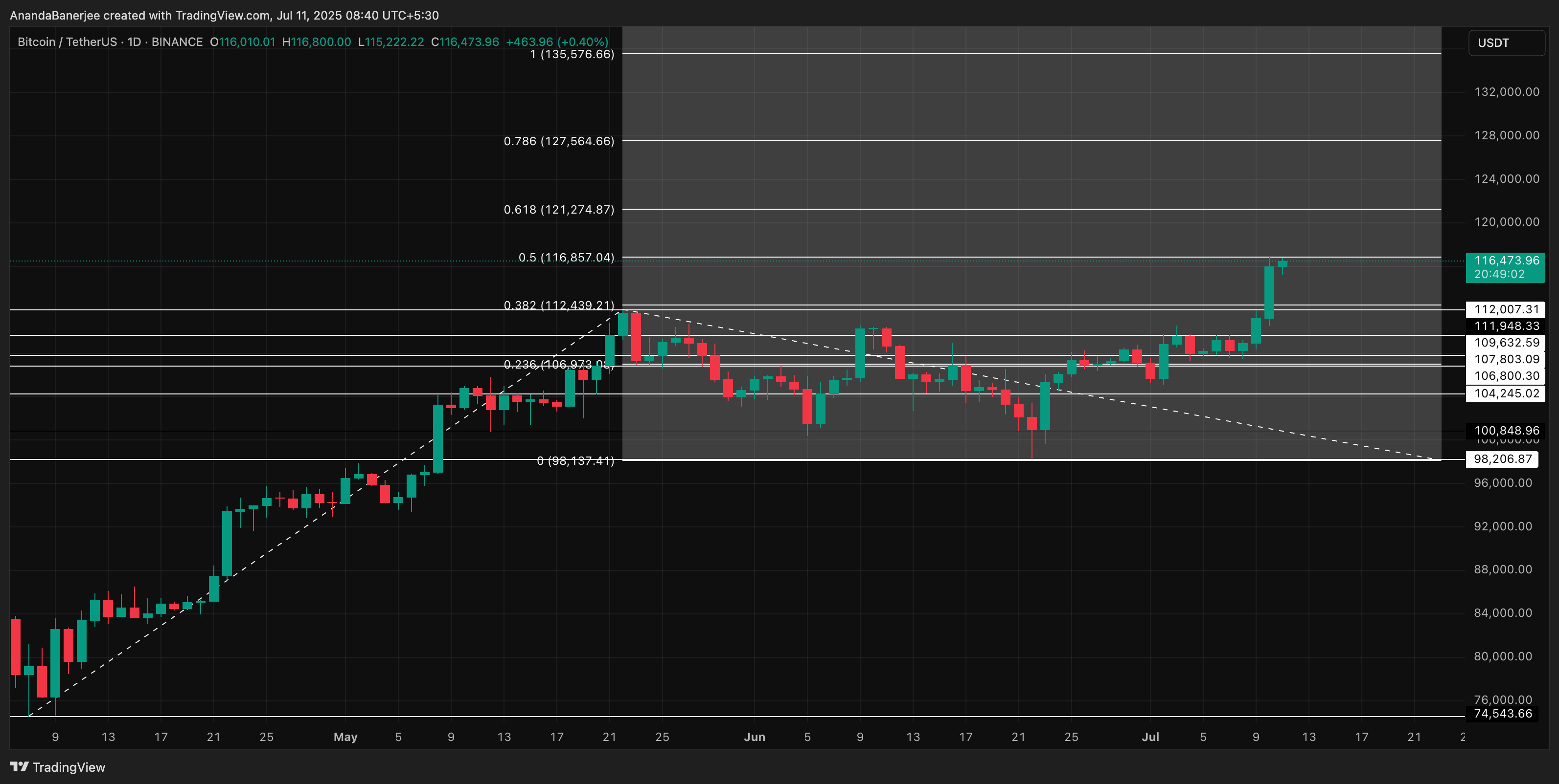 Bitkoinning so’nggi narxi $116,500 atrofida bo’lib, 0.5 Fibonacci kengaytmasi bilan mos keladi. Bu narx darajasidan yuqoriga ko’tarilish $121,000 va $135,000 tomon yo’l ochishi mumkin. Bu darajalar davom etish uchun yo’l ko’rsatadi, lekin faqat momentum saqlansa.