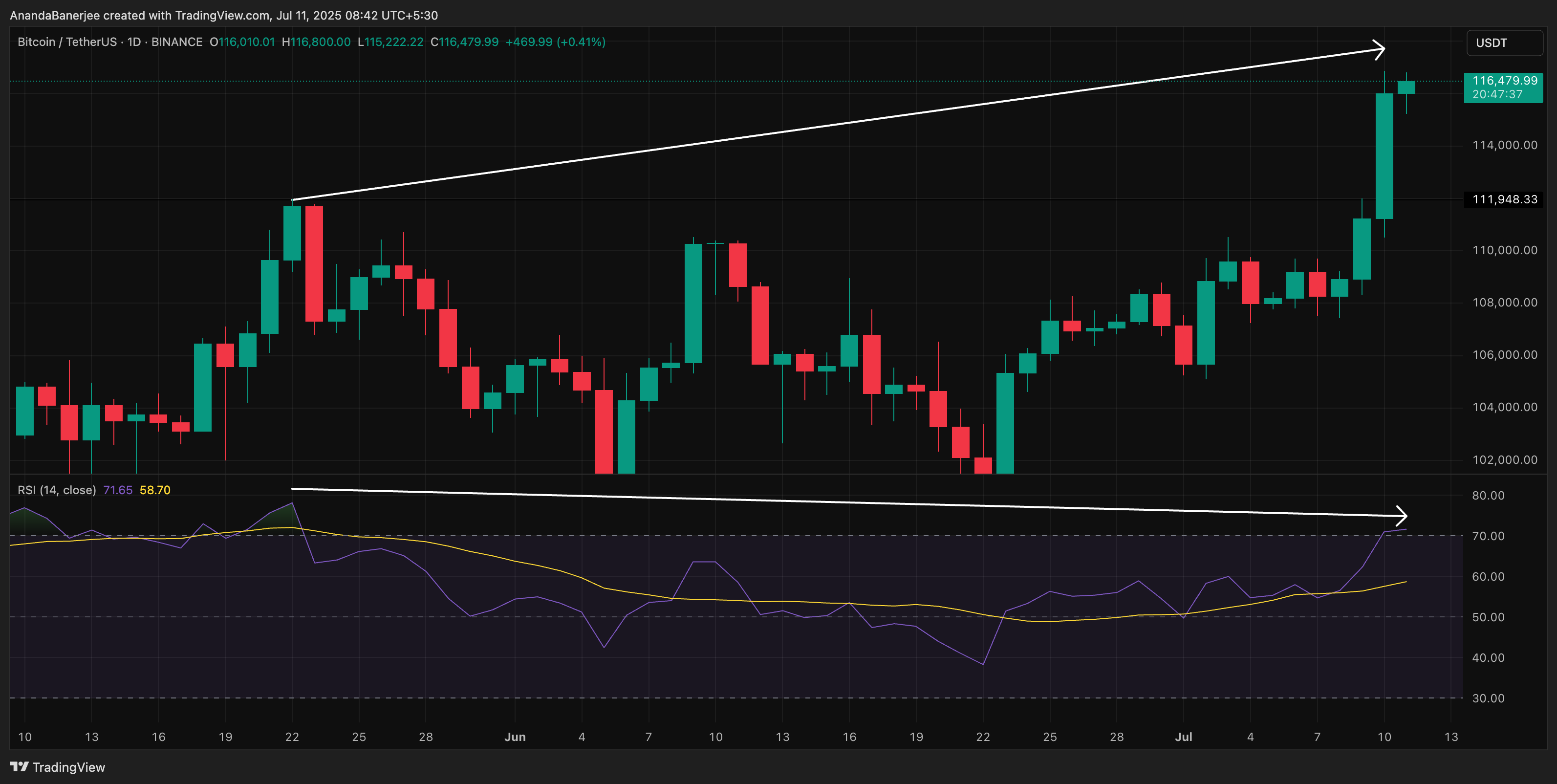 Mana xavf. Bitkoin narxi yuqoriga ko’tarilayotgan bo’lsa-da, Nisbiy kuch indeksi (RSI) pastroq cho’qqilarni ko’rsatmoqda — bu klassik ayirbosh divergentsiyasi. Bu ko’pincha tuzatishdan oldin sodir bo’ladi.