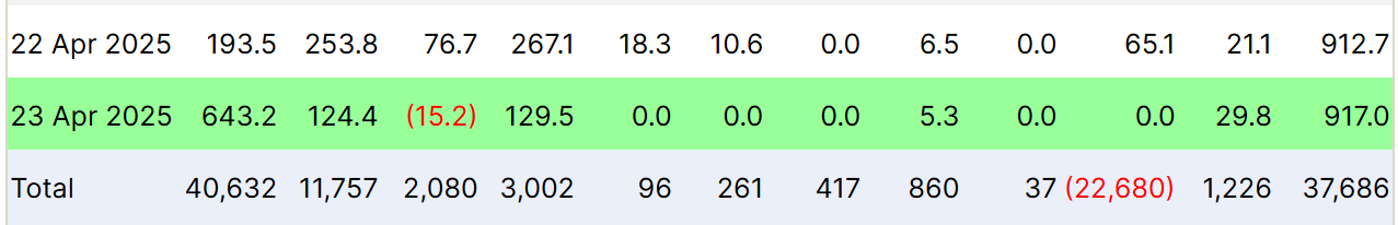 Makro harakat Bitkoin uchun tobora qulay bo’lib bormoqda, ayniqsa so’nggi spot ETF oqimlari tufayli. So’nggi ikki kun ichida Bitkoinga 1.8 milliard dollar miqdorida mablag’ kirib keldi. 22-aprel kuni Bitkoin ETFlariga 912 million dollar, 23-aprel kuni esa 917 million dollar kirib keldi. Bu so’nggi besh oy ichidagi eng yuqori bir kunlik kirimdir.