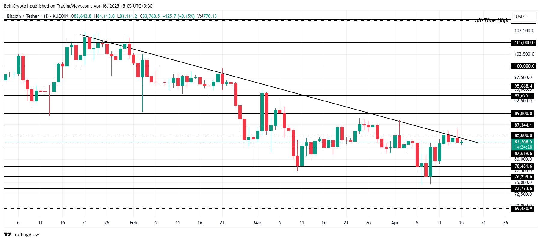 Bitkoin hozirda uch oy davom etayotgan pasayish tendensiyasini boshdan kechirmoqda, narxi $83,768 atrofida. $85,000 qarshilikni bir necha marta yengishga urinishlariga qaramay, Bitkoin o’sish tendensiyasini saqlab qololmadi. Ushbu darajadagi takroriy rad etishlar sezilarli qarshilikni ko’rsatadi, bu esa narxning yanada turg’unlashishiga olib kelishi mumkin.