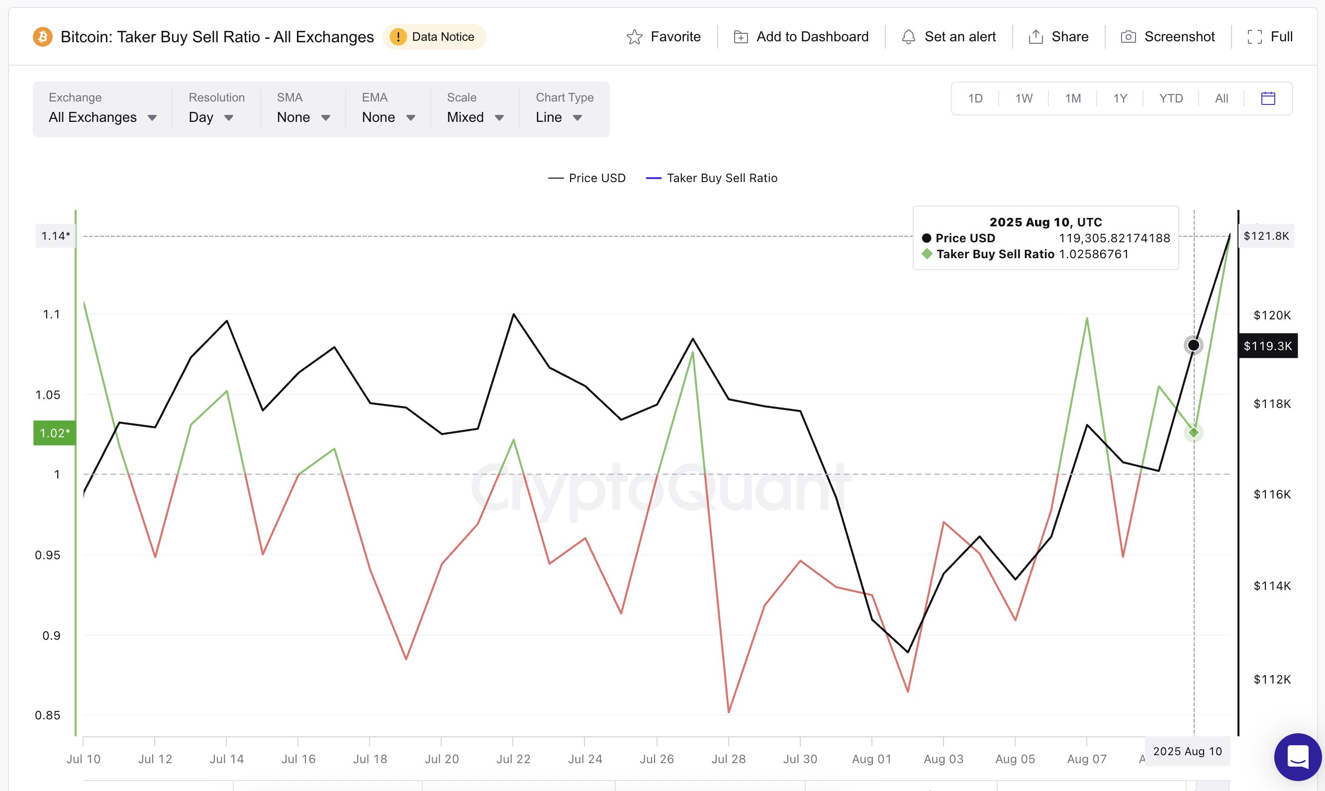 Spot bozor oqimlari ijobiy kayfiyatni tasdiqlaydi. Taker Buy/Sell Ratio, ya’ni agressiv bozor xaridlari yoki sotuvlari ustunligini o’lchaydigan indikator, 10-avgustda neytral 1.02 dan 1.14 ga ko’tarildi, bu iyul boshidan beri eng yuqori ko’rsatkichdir.