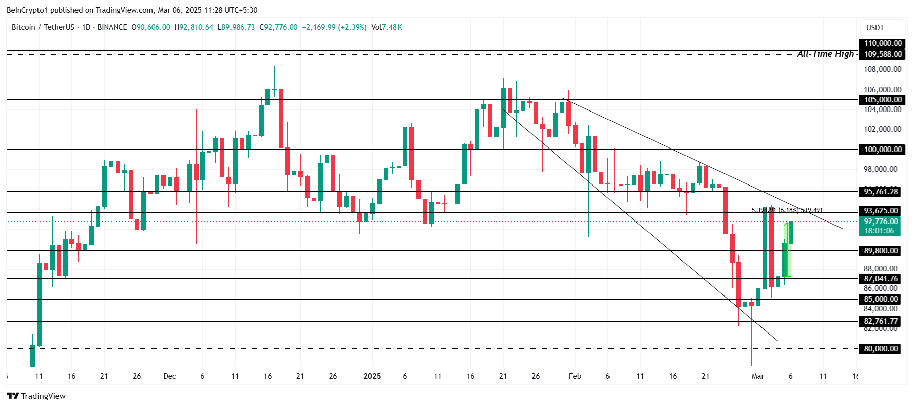 Bitcoinning narxi so’nggi 24 soat ichida 6% tiklanishni ko’rsatdi, so’nggi yangilanishga ko’ra $92,776 da savdo qilinmoqda. Kriptovalyuta so’nggi kunlarda buzishga qiynalgan $93,625 darajasidagi muhim qarshilik darajasiga yaqinlashmoqda. Ushbu qarshilikni muvaffaqiyatli buzish Bitcoinni yuqoriga ko’taradigan ijobiy o’sishning boshlanishini belgilashi mumkin.