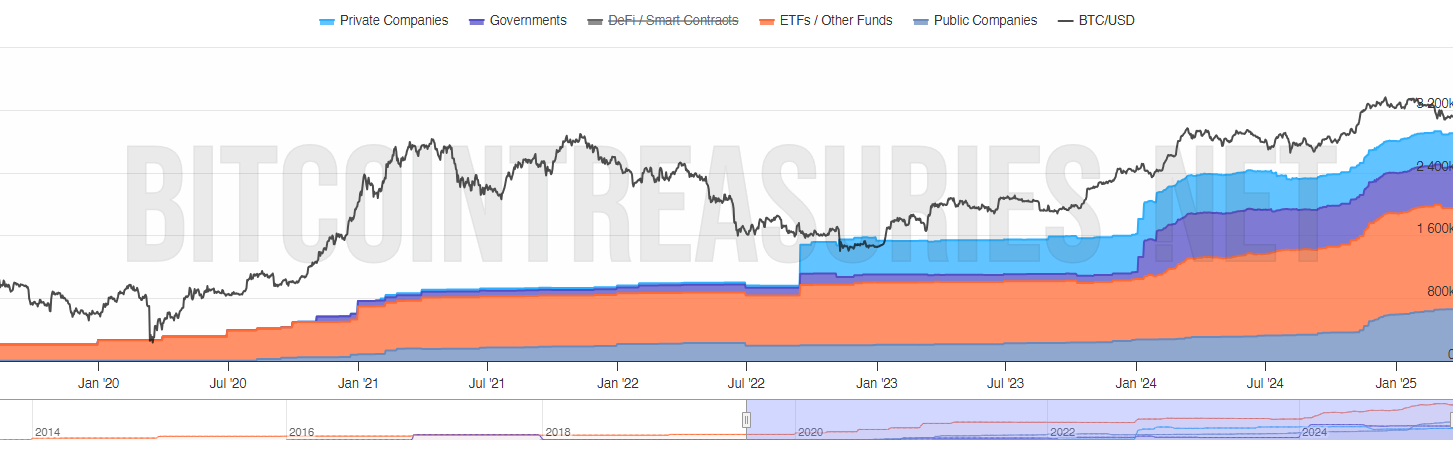 BitcoinTreasuries ma’lumotlariga ko’ra, so’nggi besh yil ichida xususiy kompaniyalar, davlat kompaniyalari, hukumatlar va ETFlar tomonidan Bitcoin egaligi 210,000 BTC dan 2.6 million BTC dan oshib, 12 martadan ko’proq oshdi. Natijada, tartibga soluvchi aralashuv Bitcoinning asosiy operatsiyalariga huquqiy bosim yoki istalmagan o’zgarishlarni kiritishi mumkin.