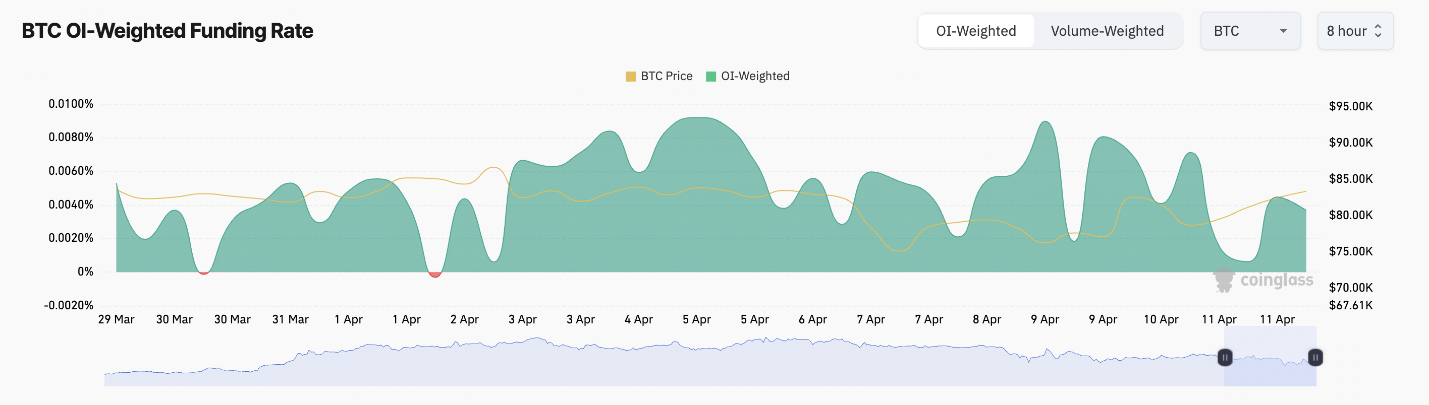 Agar u ijobiy bo’lsa, uzoq savdogarlar qisqa savdogarlarga to’laydi. Bu bozorning optimistik kayfiyatini ko’rsatadi, chunki ko’proq savdogarlar BTC narxining oshishiga ishonmoqda.