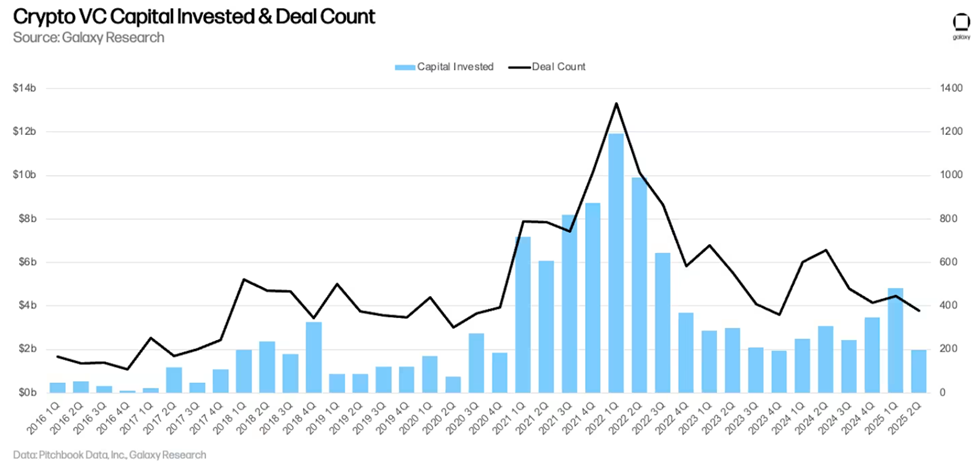 Galaxy Research-ning so’nggi raqamlari shuni ko’rsatadiki, kripto venchur kapitali besh yil ichida eng sekin chorakni o’tkazdi, 2 yilning 2-choragida sektorga 2 milliard dollardan kam oqib kirdi. Bu yil boshidan keskin orqaga qaytishni anglatadi, garchi uning bir qismi statistik qiziqish bilan bog’liq.