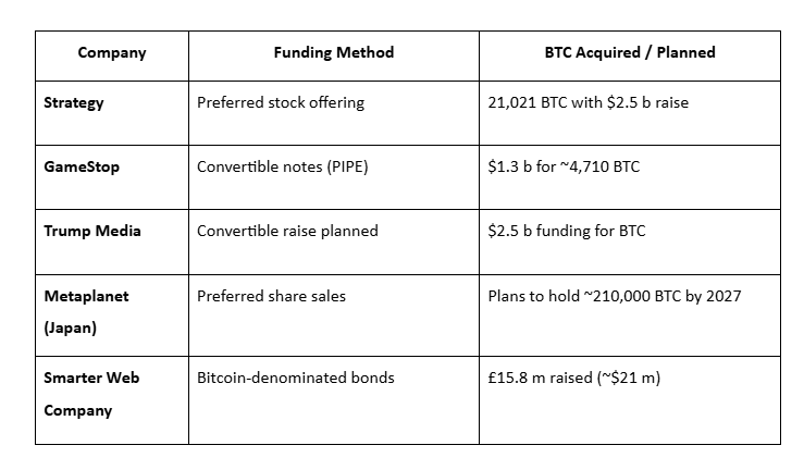 «Strategy» (ilgari MicroStrategy), «Metaplanet» va «GameStop» aksiyalarni suyultirish orqali milliardlab mablag’ yig’ib, «Bitkoin» sotib olishdi, bu esa «Bitkoin»/aksiyaga nisbatan ko’payib, kapital qiymatini pasaytirdi.