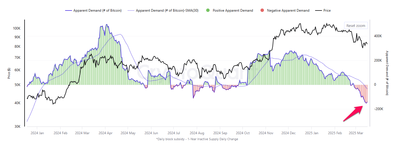 Yana bir muhim omil shundaki, CryptoQuant ma’lumotlariga ko’ra, Bitcoin talabi bir yildan ortiq vaqt ichida eng past darajaga tushib ketdi. Bitcoinning Ko’rinadigan Talab ko’rsatkichi yangi taklifni bir yildan ortiq vaqt davomida saqlanib kelayotgan faol bo’lmagan taklif bilan solishtiradi va haqiqiy talabni ko’rsatadi.