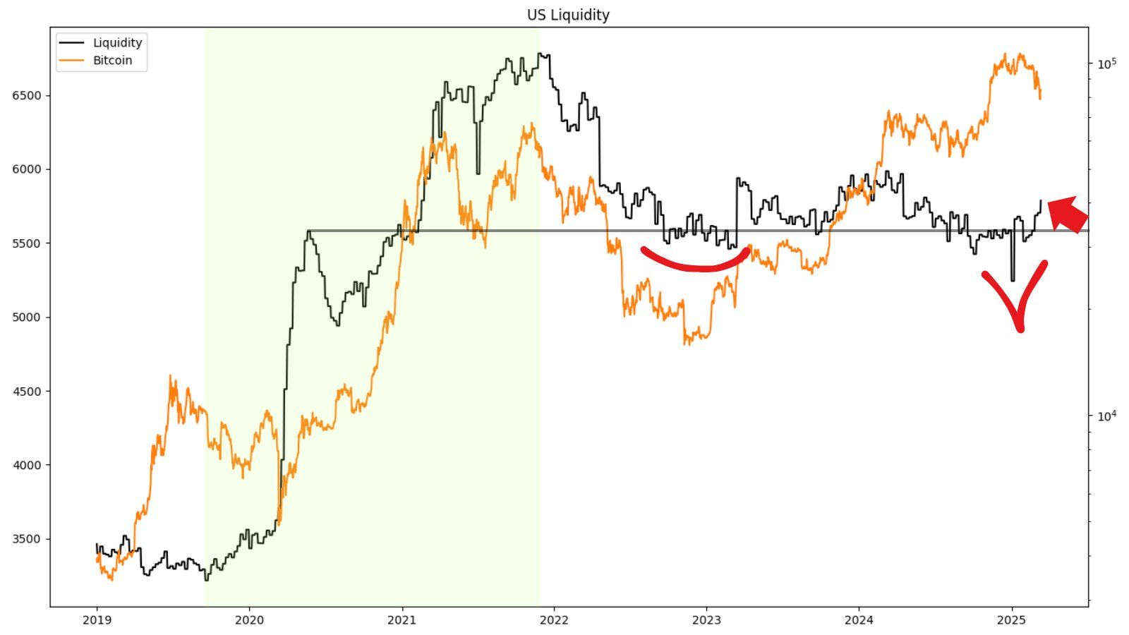 “Ushbu Bitcoin tsiklida biz asosan tekis pul tsikli bilan kurashmoqdamiz, o’tgan tsikldagi kuchli o’sish tendentsiyasiga (yashil) qarshi. Bu o’zgarishi mumkin. Hozirda AQSh Likvidligida potentsial yirik ko’p yillik pastlikning birinchi belgilari ko’rinmoqda, bugun esa eve/adam pastligi shakllanmoqda. Qattiqlashuv boshlanganiga deyarli 4 yil bo’ldi. 2025 yil tarif stresslari fonida pul-kredit siyosati tendentsiyasining o’zgarishi uchun mantiqiy bo’lardi. Keling, ushbu yangi tendentsiya saqlanib qoladimi, ko’ramiz,” deb bashorat qildi Charlz Edvards.