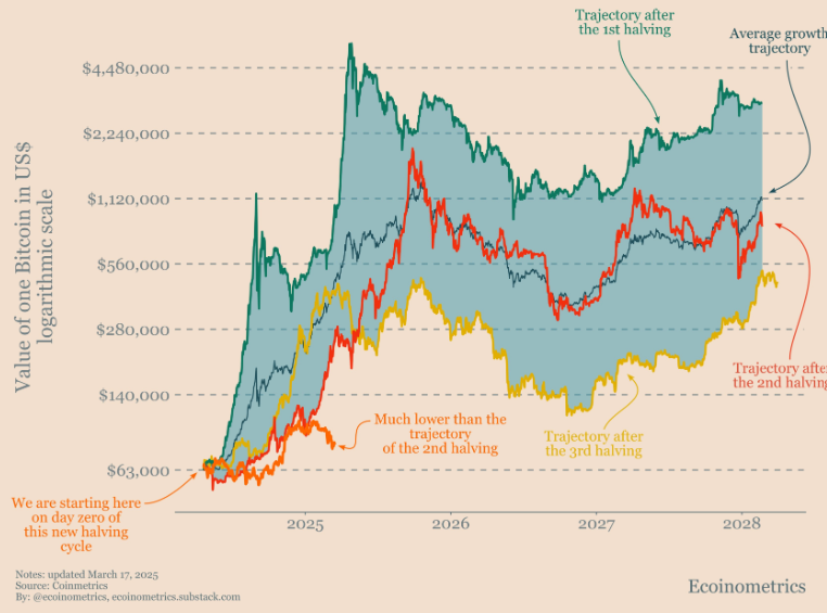 Agar Bitcoin avvalgi tsikllarga o’xshab o’ssa, uning narxi $140,000 dan $4,500,000 gacha bo’lishi mumkin edi, $63,000 dan boshlab. Biroq, hozirda Bitcoin taxminan $80,000 atrofida savdo qilmoqda.