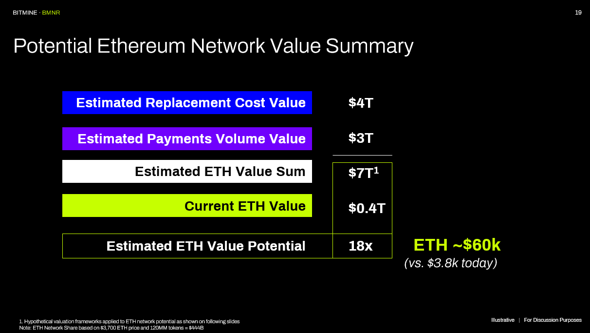 «BitMine Immersion Technologies» kompaniyasi o’zining so’nggi taqdimotida «Efirium» (ETH) uchun 60,000 dollarlik qiymatni taklif qildi. Bu qiymat noma’lum tadqiqot firmalari bilan maslahatlashuvlar asosida belgilangan.